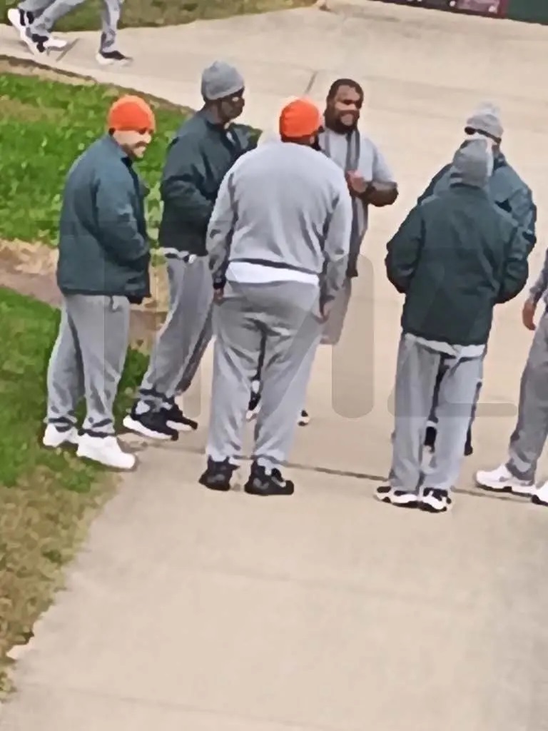 Diddy speaking with other prisoners at Fort Dix. He appears to be handing them something. I wonder if it is baby oil (kidding).