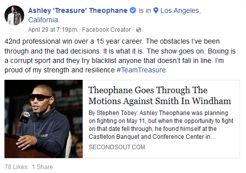Ashley Theophane's post about the problems occurring at Mayweather Promotions People expect wrestling matches to be staged, as it's full of theatrics. However, people do not expect boxing matches to be staged, as that's not how it's supposed to work. That's not what they paid money for when they purchased tickets, as they believe boxing is real, as it is supposed to be. Boxing is a great sport and deserved better than this. The boxer and promoter in question should not have done this. It never should have happened and the consequences will reverberate, as governments are watching. Due to greed for money, fame and attention, they are going to take boxing down. To do the wrong thing to gain a few short years of unearned glory and money, to end up with a lifetime of shame, disgrace and financial loss when caught, was a terrible idea. RELATED ARTICLES Adrien Broner Scores Controversial Win Over Ashley Theophane Fight Rigging Is The Equivalent Of Making A Fool Of The Fans |