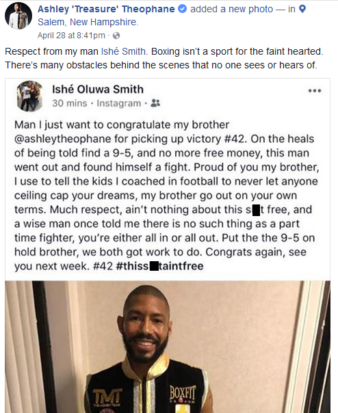 Ishe Smith and Ashley Theophane Theophane has been released from his Mayweather Promotions contract in a mutual decision, in favor of starting his own company, as he has only been getting one fight per year since 2015. Other boxers in the Mayweather stable have not been fighting much, which means less income for them and the company. However, once again, the demand has decreased for boxing in America. It has fizzled out. There was also a problem regarding Mayweather's protégé Gervonta Davis. He was complaining of money problems, as written about on a few boxing sites. For a time, Davis even left Las Vegas and went back home to Baltimore, upset at how things were unfolding. Mayweather Promotions had to work on coaxing him back to Las Vegas.