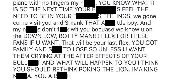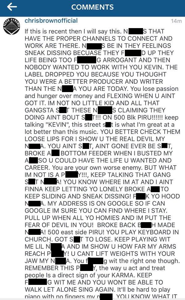 Chris Brown's profanity laced threat against Kevin McCall posted to Instagram (redacted by the Judiciary Report) Rather than stating the phrase, "I'm gonna put the fear of God in you" Brown changed it to, "I'm gonna put the fear of the devil in you." Brown belittled McCall for being a churchgoing Christian, contrasting it with his life as a member of the deadly Bloods Piru. Brown's fans immediately became alarmed and begged him to stop making threats, lest he ends up arrested. Brown then deleted the post. However, some people saved copies of it and posted it on other sites. RELATED ARTICLES Chris Brown Calls Fans Trolling Him On Instagram 'D**kheads' |