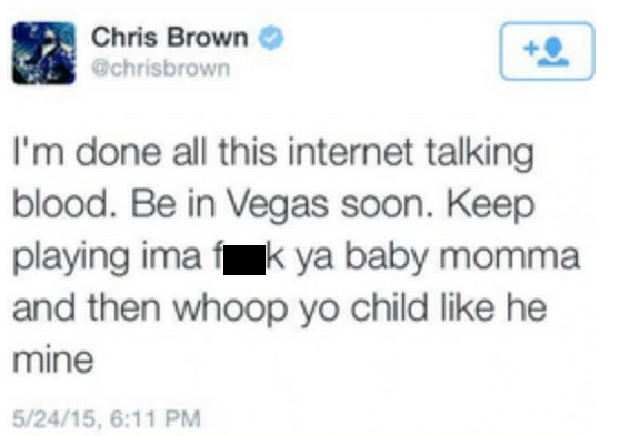 Chris Brown threatening Tyson Beckford The threat regarding Beckford's son ws in addition to Brown calling on his Bloods gang associates regarding the model, posting an item with gun emoji as a threat. Brown's fans, as well as those of Tran and Beckford are not pleased with the singer's threats. Brown's publicist is having a meltdown at what he posted online for all to see.