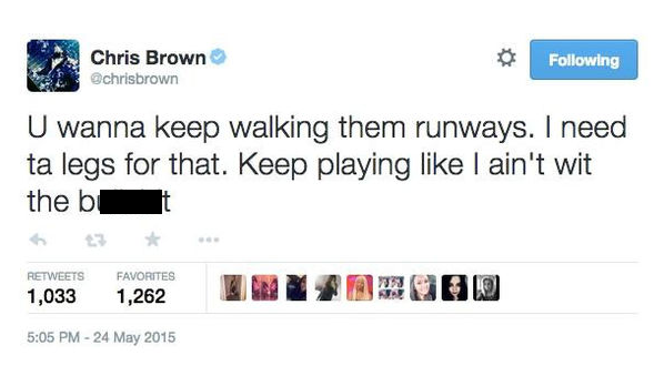 Chris Brown threatening Tyson Beckford Chris Brown threatened to beat Tyson Beckford's preteen son and have sex with the boy's mother, over the model posing for an innocent photo with the singer's ex-girlfriend, Karrueche Tran. Brown tweeted the item then deleted it. However, people online screencapped the items before Brown deleted the threatening tweets.