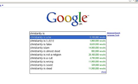 Google is being accused of eliminating "offensive" search terms regarding Islam. They are also being accused of promoting offensive search terms about Christianity, via its suggested items. Google 'censors its website so anti-Islam searches fail to appear' Last updated at 2:16 PM on 10th January 2010 - Search engine Google has been accused of censoring its results after users discovered it never suggests search terms when it comes to Islam. In a time-saving feature the internet phenomenon, whose motto is 'don't be evil', helpfully suggests common searches as people type in what they are looking for. For example, if you type in 'Christianity is' in the search bar a whole range of options flash up including controversial suggestions such as 'Christianity is fake' and 'Christianity is a cult'. But anyone typing in a similar phrase which replaces Christianity with Islam gets no suggestions at all... A Google spokesman claimed the strange absence of results was a software problem. He said: "This is in fact a bug and we're working to fix it as quickly as we can.'... |