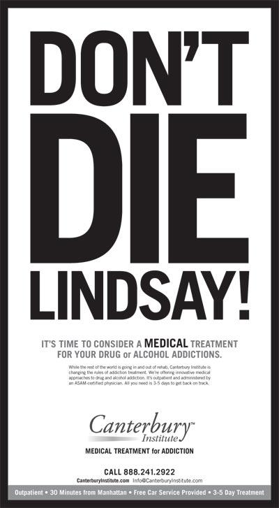 It’s amazing how this woman, Lindsay, is in rehab, flunking drug tests and engaging in drug use and adulterous sex, while claiming to the cameras that she is getting better. And that’s another thing, stop looking so desperate and blood hungry when you spot a camera pointed at you. It looks so fake and desperate. At the rate she’s going she will OD at the club like River Phoenix, because she clearly isn’t taking her sobriety or lack thereof seriously. She is going to get out of rehab and go right back into the same mess she was in before, trivializing the whole process. Speaking of that, this ad ran last month: It should have read "Don't Lie" because that's all she's doing: