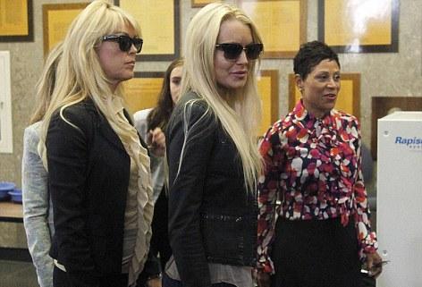 Dina Lohan in court today, living vicariously through her daughter, Lindsay, as mentioned yesterday, who is smirking again, whilst both wear matching hair extensions and very similar clothes To Dina Lohan: you need to stop enabling your daughter, as you will regret it if you end up standing over her casket, after one of her drug binges ends in an overdose or she dies early from alcohol poising or a combination of both.