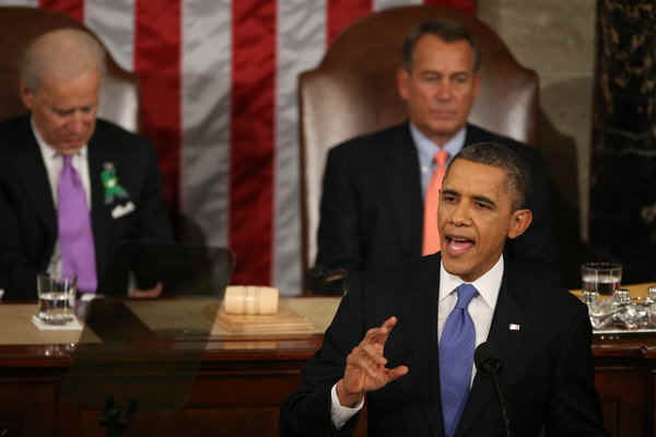 Vice President Joe Biden, President Barack Obama and House Speaker John Boehner U.S. President Barack Obama's State of The Union address last night contained many claims and promises, but will he be able to make good on them in the current financial climate gripping America. Obama offered examples of what he deems his successes with the U.S. economy. However, one cannot deny the fact, the financial climate in America is still very bad, as cost of living continues to surge and income and job availability decreases. This is a dangerous combo. At the heart of the matter is a badly damaged economy that spans two presidents. Both went about correcting the damage in different ways, but neither has solved the problem, leaving America in a quagmire. RELATED ARTICLE |